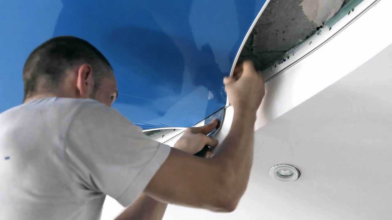 Потолочное полотно из ПВХ расправляется после обработки тепловой пушкой — мощным тепловентилятором — и закрепляется на профиле при помощи специальных монтажных лопаток.