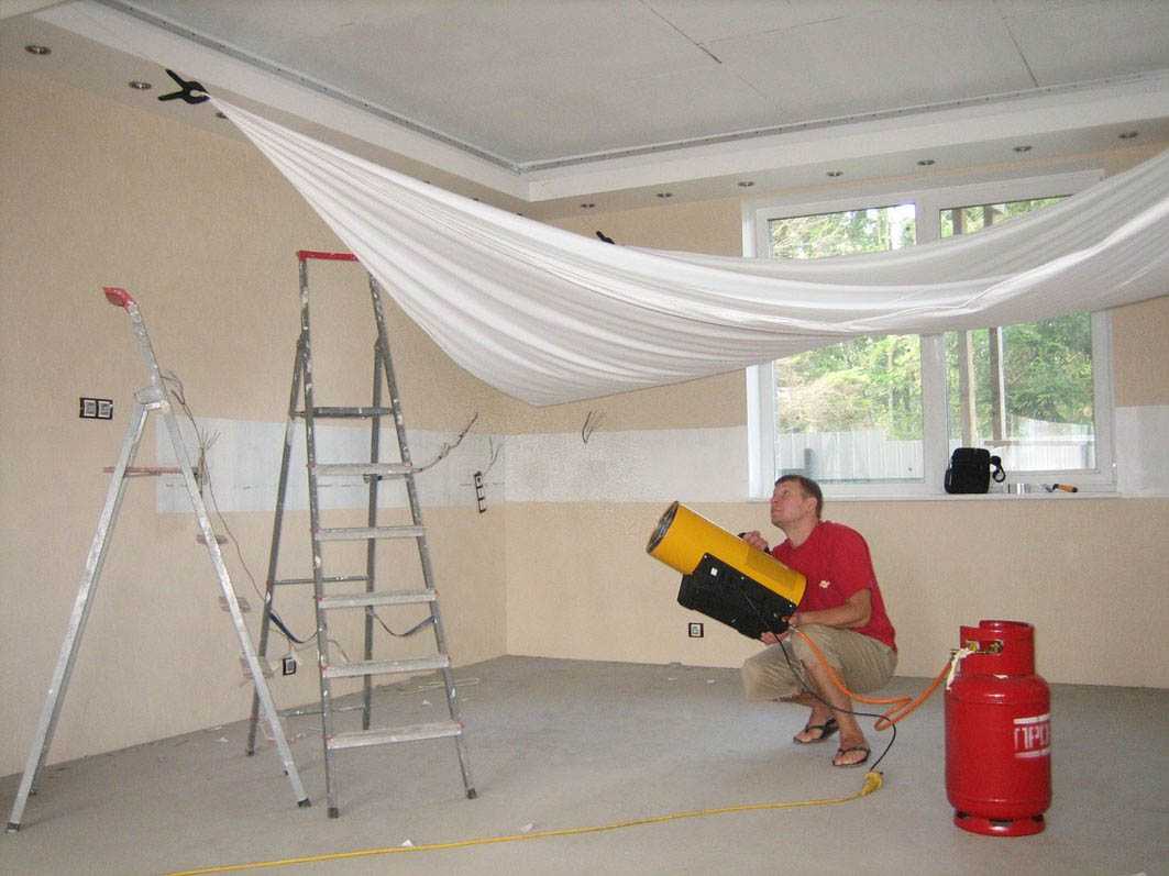 - газовую либо электрическую тепловую пушку для нагревания комнаты и ПВХ-полотна;