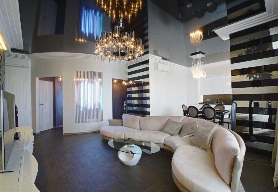 Арка является плавным переходом от стен (одной или нескольких) к потолку. Радиус элемента может быть разным. Использование зеркального или глянцевого полотна дает возможность визуально увеличить высоту помещения. Если арки сделать по периметру, то потолок станет выглядеть как купол.