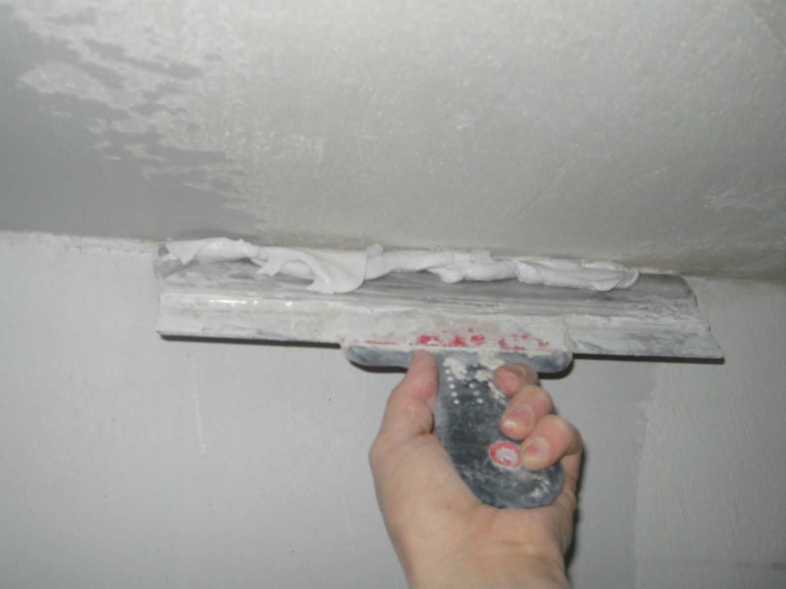 После того, как с помощью шпателя было снято старое покрытие, требуется зачистить поверхность: заделать трещины и ямки, удалить различные пятна и разводы (см. ). Побелка потолка мелом должна начинаться лишь после того, как высохнет поверхность.