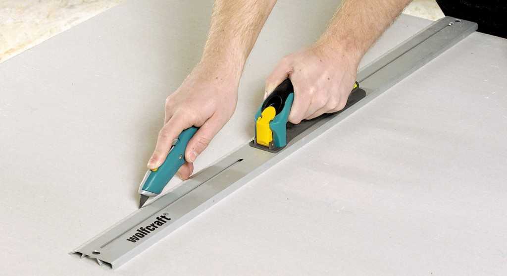 Используя нож или пилу, подрезаем листы гипсокартона до нужного нам размера. Режется гипсокартон просто, и в большинстве случаев достаточно прорезать верхний слой бумаги, после чего – просто разломить лист по линии разреза.