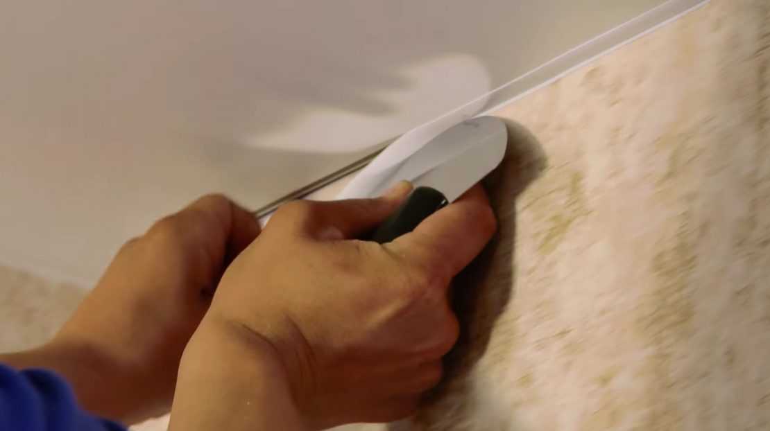 В ходе работ не стоит использовать шпатель, чтобы не повредить поверхность каната или полотна – вполне достаточно прижать его рукой. Жгутик должен плотно прилегать к натяжному потолку и стенам.