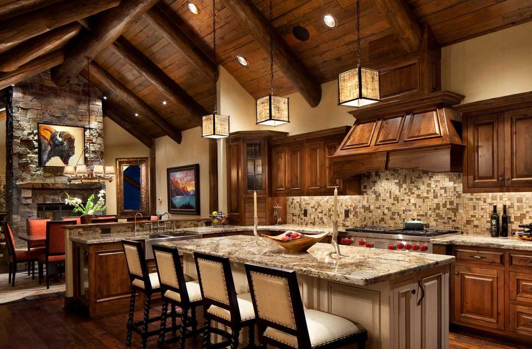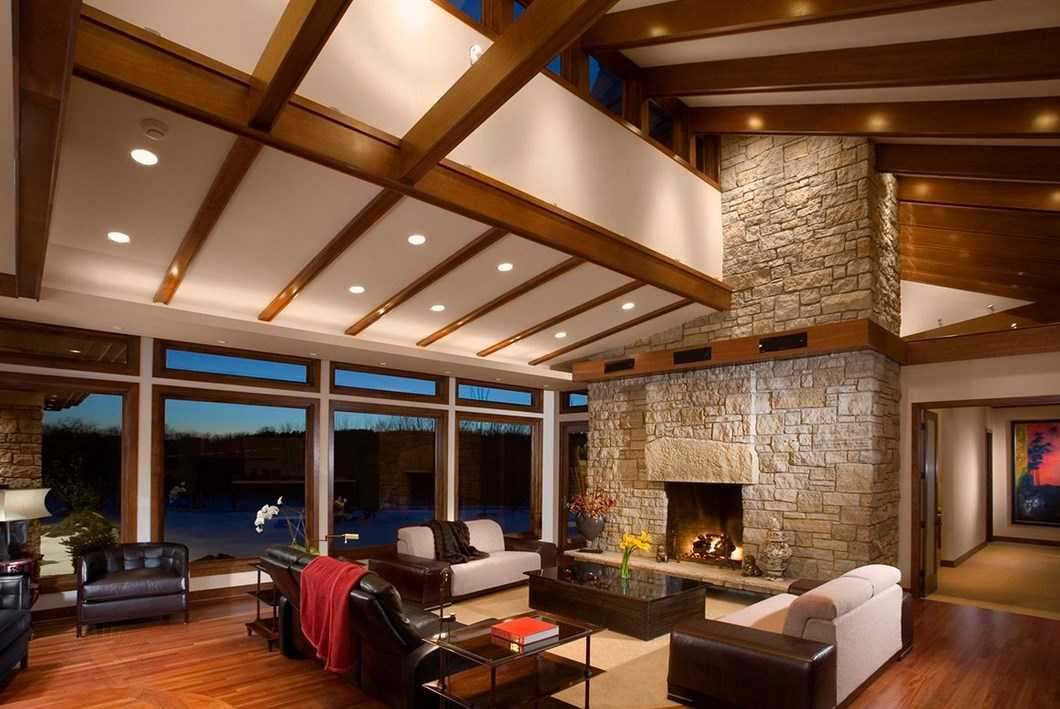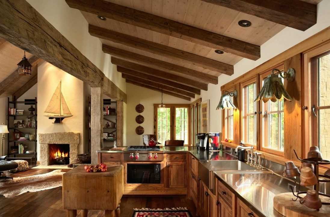 Для этого стиля потолочные перекрытия из натуральной древесины обязательны. В просмотрых комнатах с высокими сводами в качестве украшения крепят сложные конструкции из натурального бруса. Если высота стен не позволят декор из массивных элементов, перекрытия обозначают обычной доской.