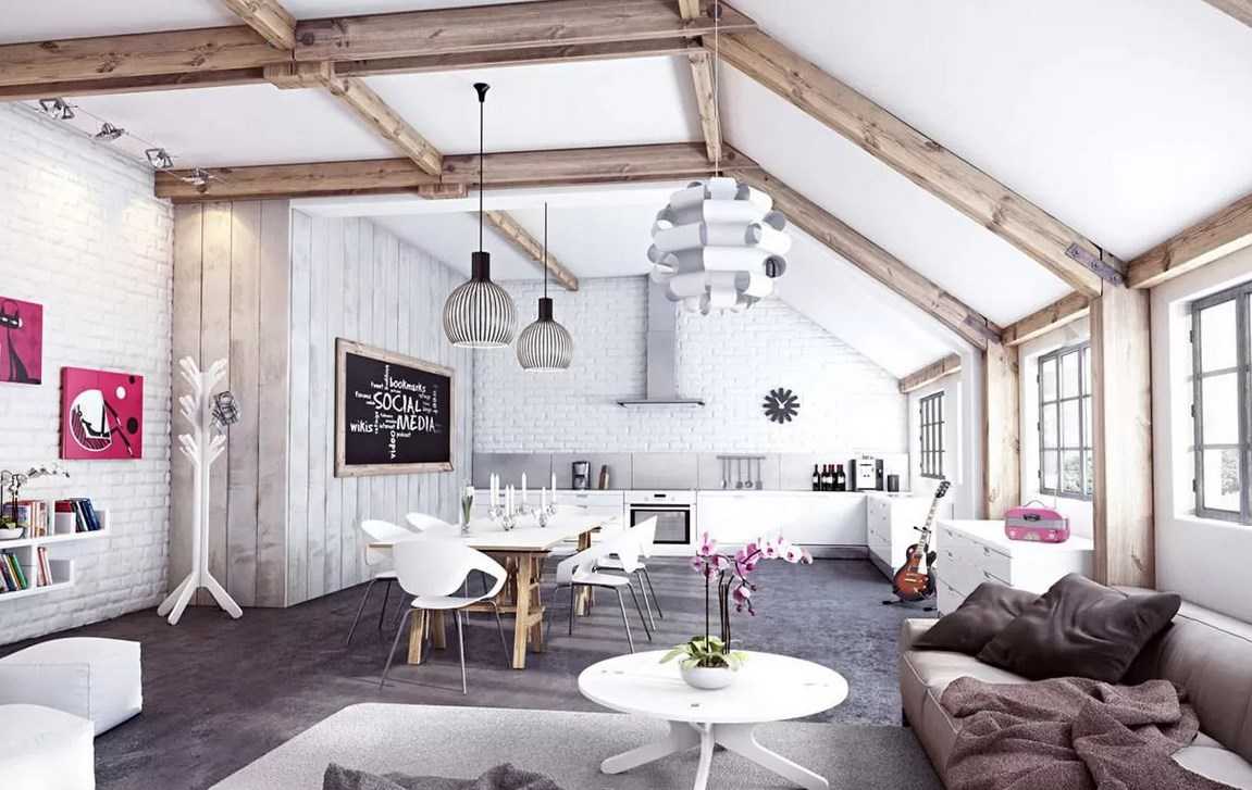 Скандинавский стиль предполагает наличие большого количества естественного света. Потолок и стены в нем обычно белого цвета. Полы изготавливают из светлой древесины. Балки на потолке могут быть естественного светлого оттенка дерева или окрашенные в белый цвет.