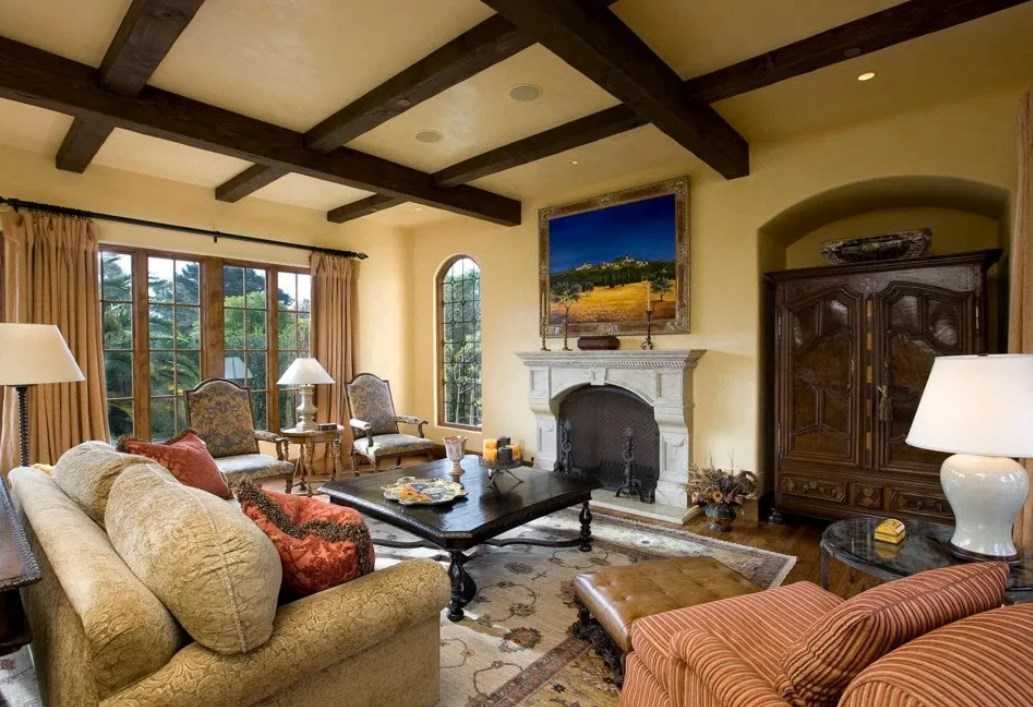 В современной классике нет былой помпезности. Комната остается просторной даже при использовании дорогой мебели из массива дерева. Своды в помещении оформляют балочными конструкциями простой формы с лаконичной текстурой. Их строят из древесины либо из гипса. Часто элементы укладывают в виде квадратов или прямоугольников.