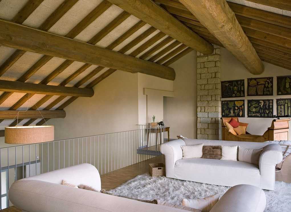 На заметку!Стиль рустик очень напоминает шале. Потолочные балки здесь тоже делают массивными и выступающими внутрь жилого пространства. От стиля шале их отличает плохо обработанная поверхность и наличие дефектов.