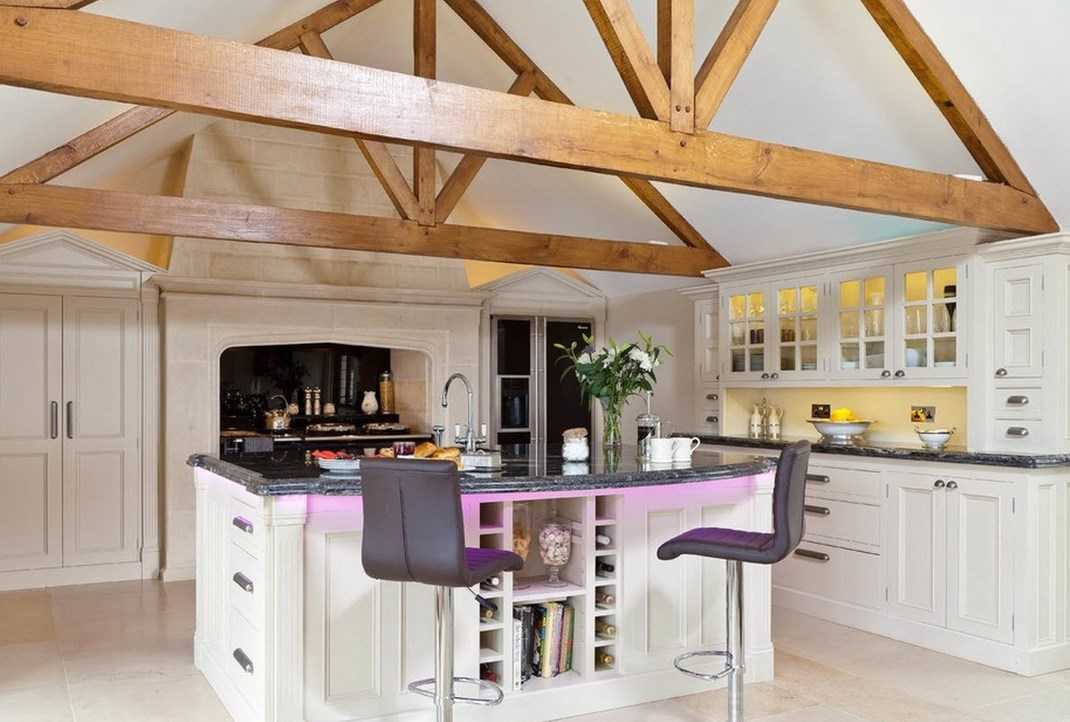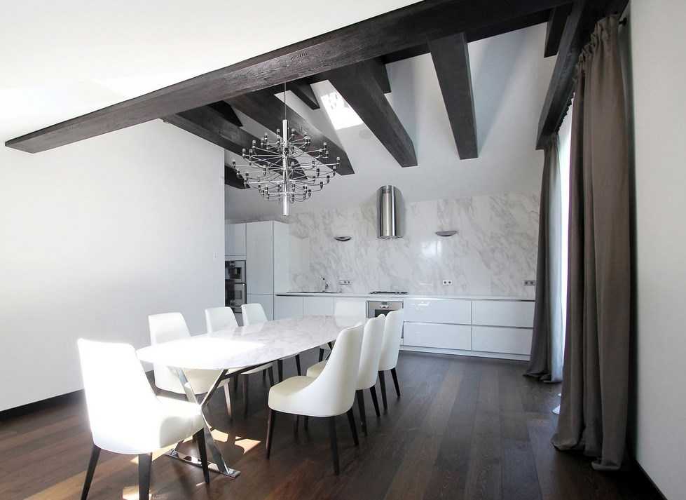 На фото светлая кухня-гостиная, потолочные перекладины выполнены по принципу кровельной конструкции.