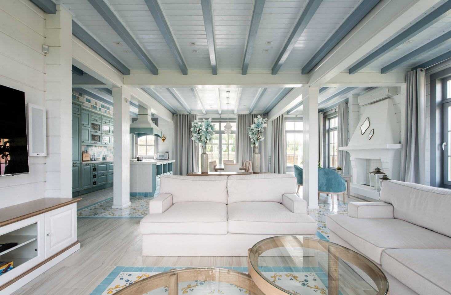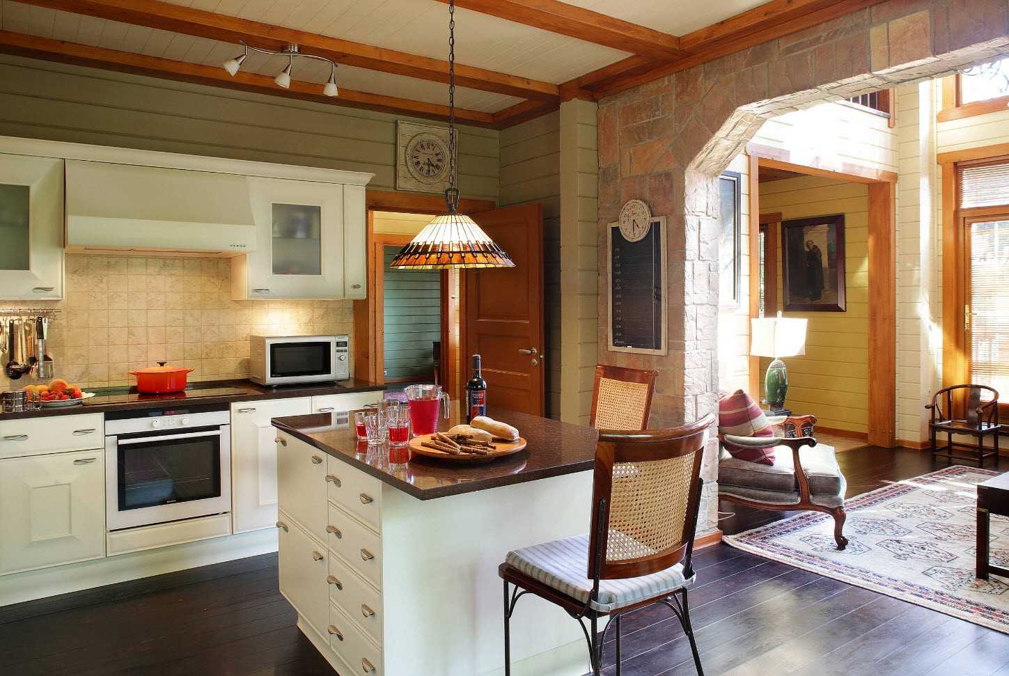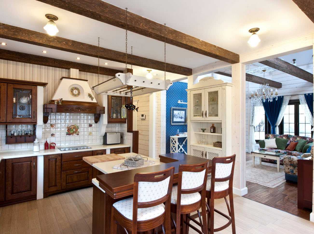 Такая отделка не обязательно будет прерогативой загородного дома. Если остальной интерьер соответствует, потолок из бруса неплохо смотрится и в обычной квартире, а доказательство – на фото далее.