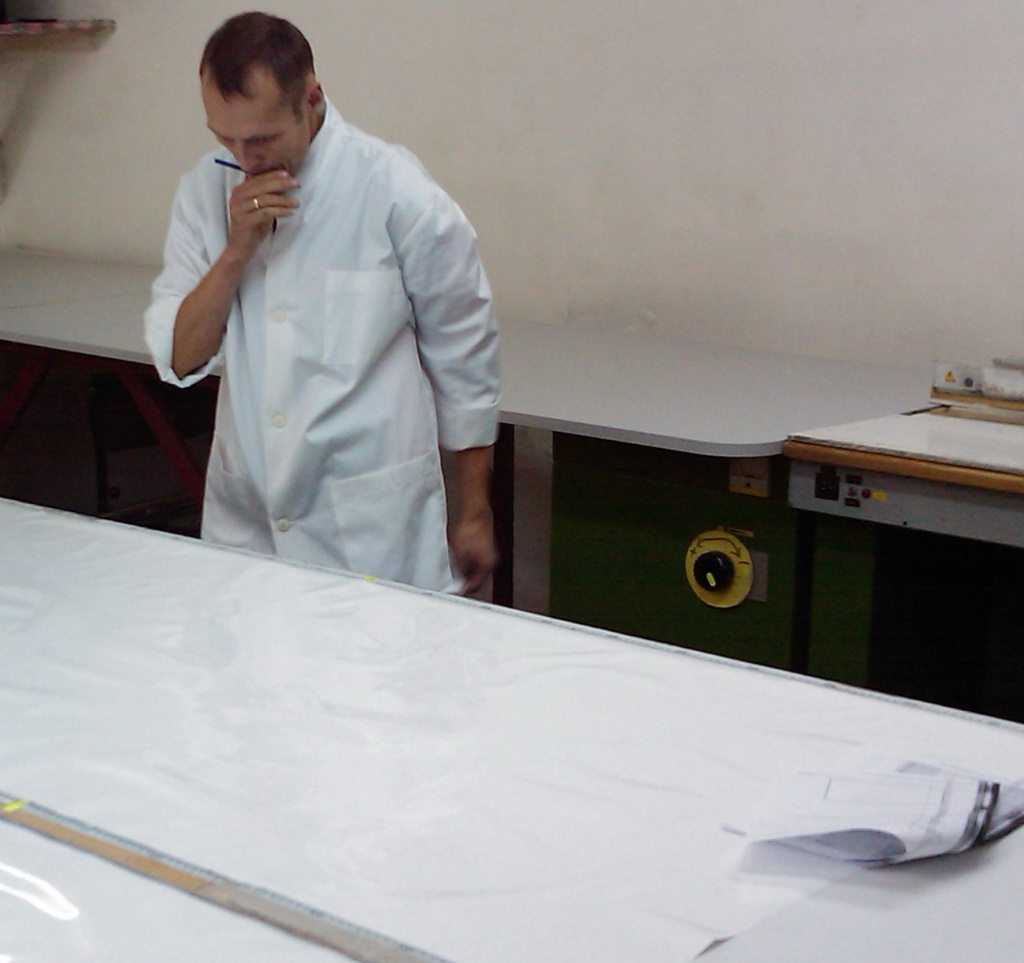 Вначале определяются габариты помещения, в котором заказчику необходим натяжной потолок. Листы ПВХ раскраиваются и сшиваются на специальном станке друг с другом, чтобы получить полотно нужной длины и ширины. Затем оно сворачивается в рулон, упаковывается и отправляется заказчику.