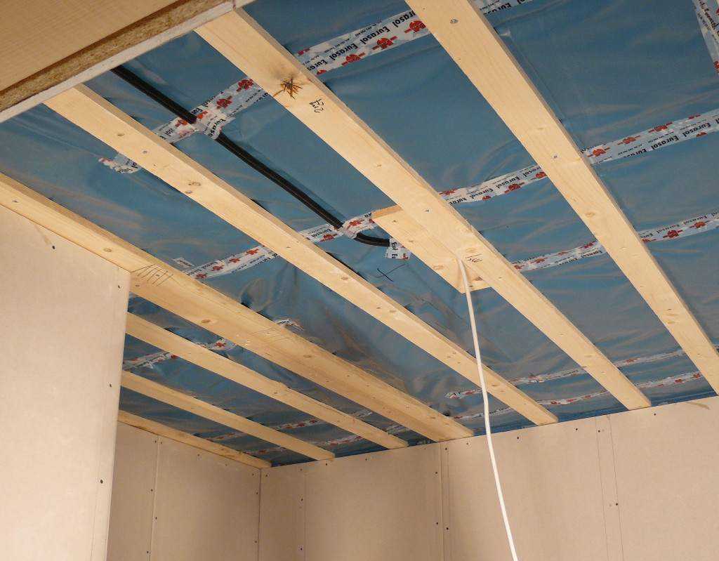 Брусья закрепляются на потолке в направлении перпендикулярно будущему монтажу досок, строго контролируется горизонтальность конструкции.