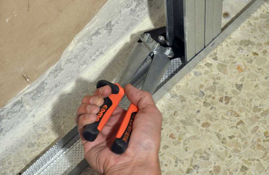- Стойки фиксируются при помощи просекателя либо саморезов. Для того чтобы каркас приобрел жесткость, каждую стойку необходимо связать со стеной посредством кронштейнов. Их крепят к стене на дюбеля с шагом 500–600 мм. В дальнейшем их края загибаются и крепятся к профилям при помощи саморезов. При этом надо избежать искривления стоек, контролируя уровнем их вертикальность.