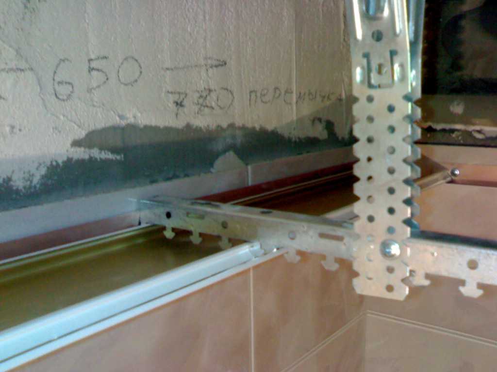 - По отметкам на стенах крепим пристенный профиль для подвесного потолка. Шаг установки крепежных элементов 30-40 см.