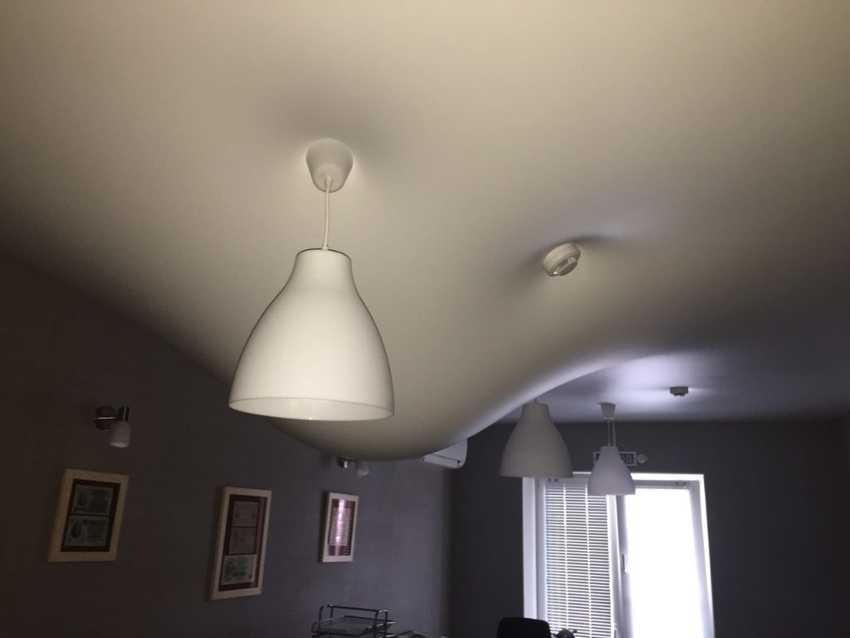 Обнаружив вместо привычной гладкой поверхности грозно нависающий гигантский пузырь, необходимо срочно принимать меры. Во-первых, не факт, что монтажные работы были проведены качественно. Никогда нельзя исключать возможность того, что покрытие сорвется со всеми вытекающими в прямом и переносном смысле последствиями. Во-вторых, подвесные конструкции часто скрывают электропроводку и приборы освещения. Затапливать их никак нельзя — это грозит в лучшем случае коротким замыканием.