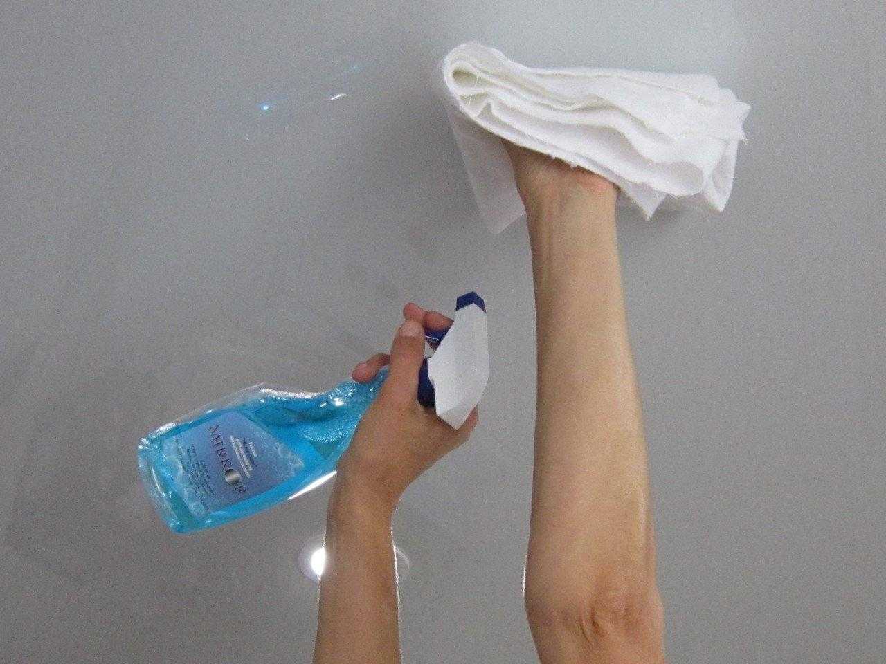 При этом разбрызгивать аэрозоль следует не на само полотно натяжного потолка, а на мягкую салфетку, после чего лёгкими круговыми движениями выполнять очистку потолка.