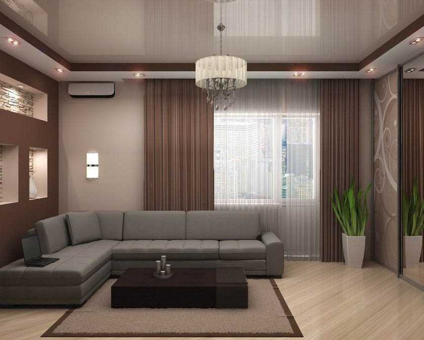 Для малогабаритной гостиной лучше выбрать аккуратный и элегантный светильник без лишнего декора. В вытянутой и узкой комнате будет уместно симметричное размещение двух небольших световых источников.
