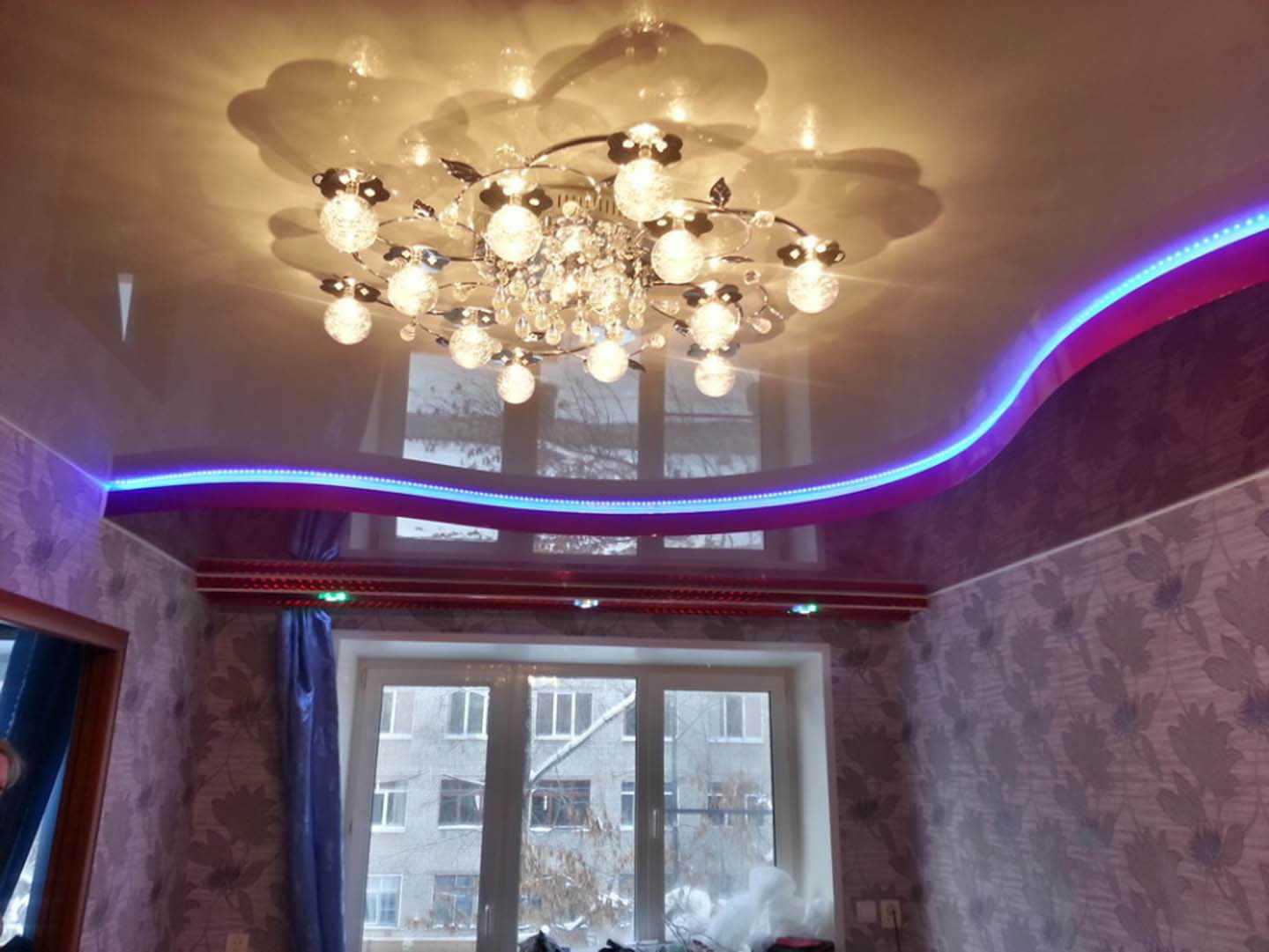 В случае установки люстры с лампами накаливания, расстояние от полотнища до ламп должно рассчитываться по схеме: мощность 60 Ватт – расстояние 60 см. Чем слабее лампы, тем ближе к полотну они могут быть расположены. Это правило не касается светодиодов и точечных светильников.