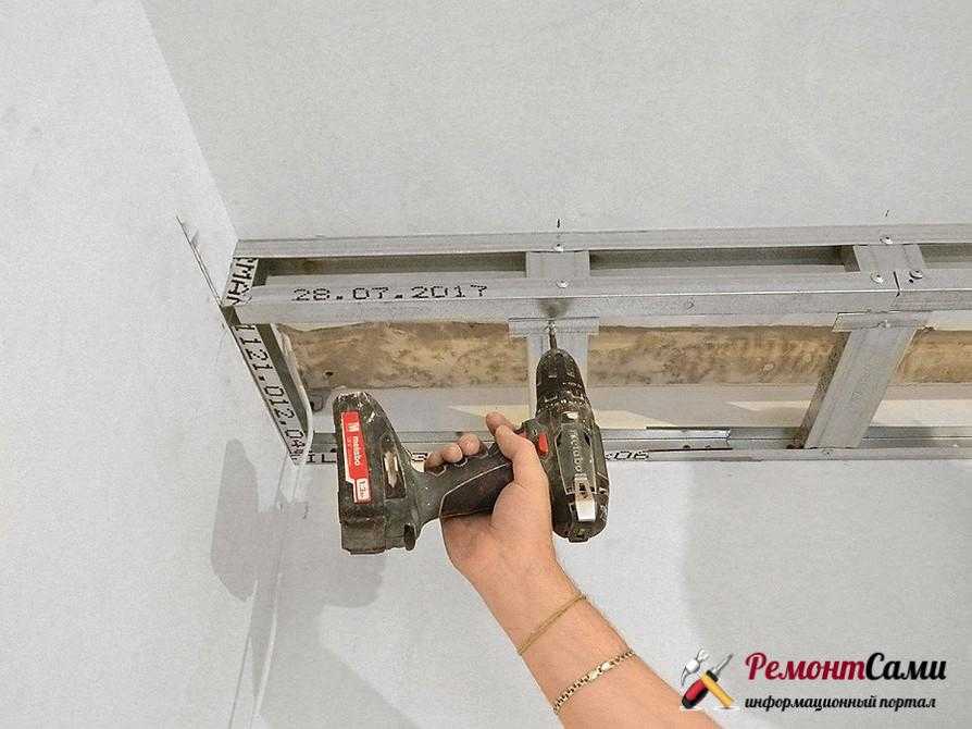 Торчащие концы подвеса отогните в стороны, и также скрепите шурупами места стыковки UD и CD. Далее мы разберём, как выровнять потолок гипсокартоном, устанавливая ГКЛ.