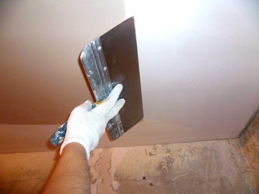 В первую очередь заделывают крупные щели и неровности. Для тех, кто знает, как выровнять потолок шпатлевкой, нет ничего сложного. Это производится специальной шпатлевкой, предназначенной для черновых работ, смешанной с паклей.