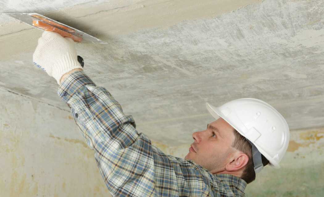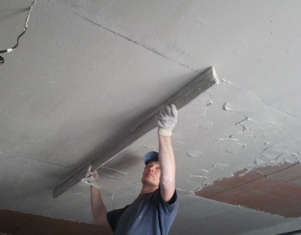 Оштукатуриванием выравнивают перепады потолка от 2 до 5 см. Нанести на потолок такой слой шпаклевки невозможно, т. к. она не будет держаться. У штукатурки сцепление с поверхностью лучше, кроме того, для ее укрепления применяют армирующую сетку.