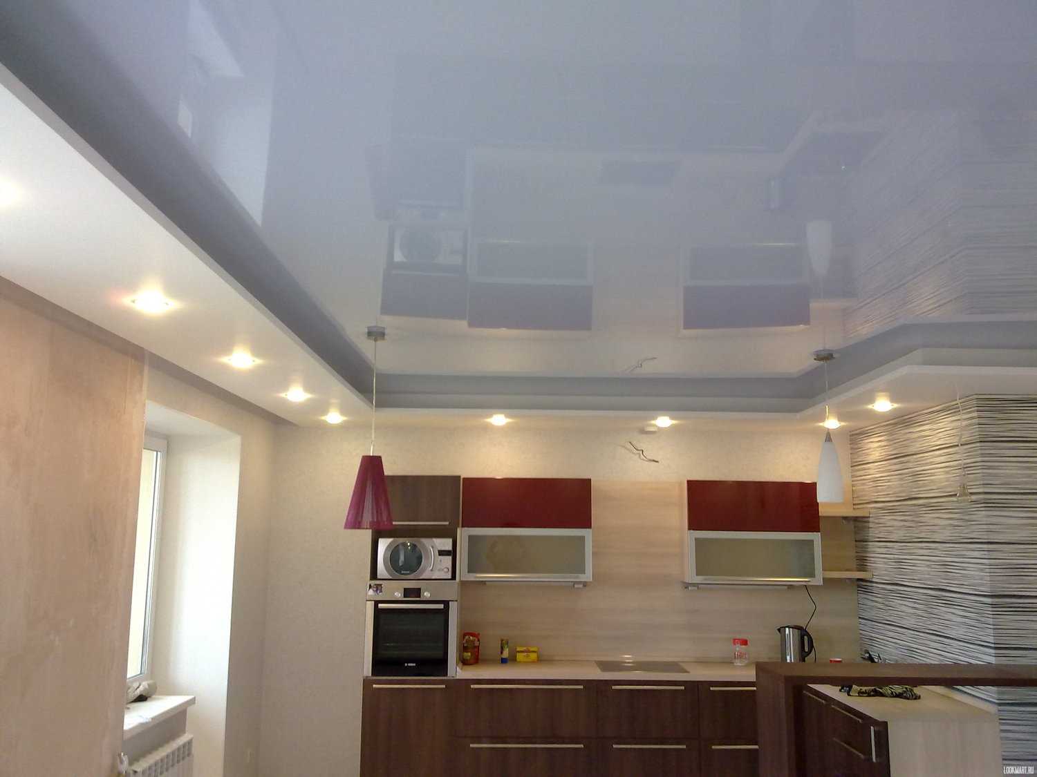 - Кухня. Наиболее уместным будет монтаж виниловых натяжных потолков. Они способны придать ей яркие цвета отделки, глянцевый блеск визуально увеличит пространство, скользящая поверхность позволит с легкостью отмыть с потолка всю оседающую на нём пыль и частицы жира;