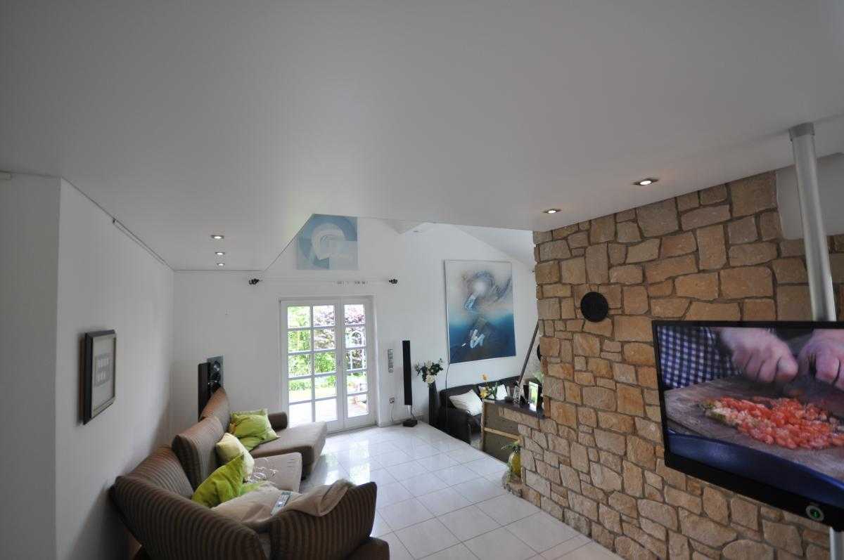 - Гостиная и прихожая. Специалисты рекомендуют применение матовых, сатиновых и тканевых полотен. Их использования, позволит создать в помещении общего пользования атмосферу благородства и уюта. Глянец в данной ситуации не уместен, т.к. в его полотне будет отражаться установленный по комнате телевизор и прочие предметы интерьера, что не уместно. В случае наличия установленного шкафа-купе, в прихожей и гостиной может быть осуществлен монтаж матового полотна натяжного потолка, произведенный вровень с рейками, придавая дизайну комнаты законченный вид;