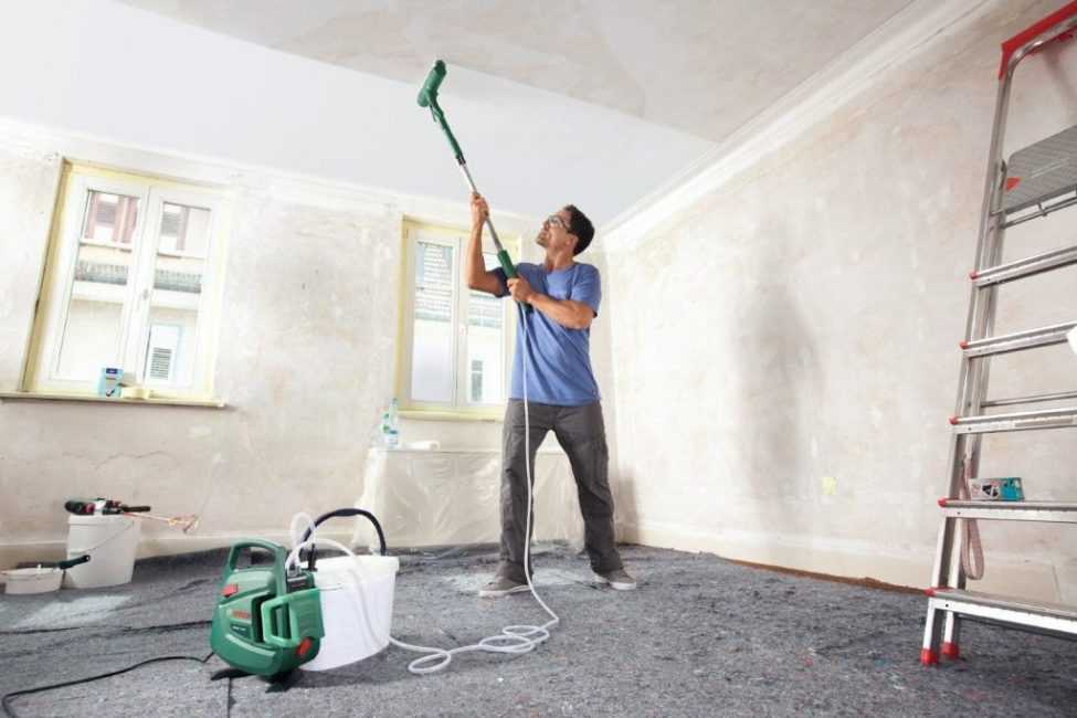 Сначала нужно освободить помещение от мебели и других посторонних предметов. Если планируется только косметический ремонт, покраска одного потолка, тогда стены следует закрыть защитной пленкой, чтоб защитить стены от попадания красящей эмульсии.