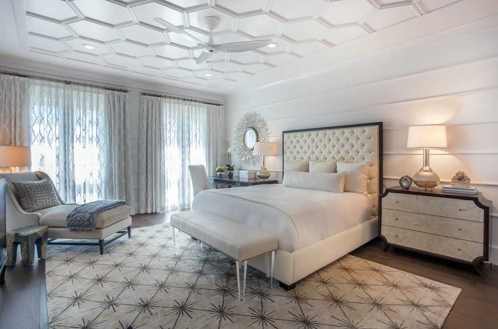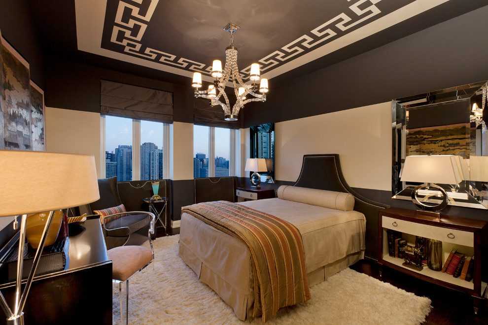 На фото интерьер спальни в темных тонах с белым одноуровневым потолком из гипсокартона.