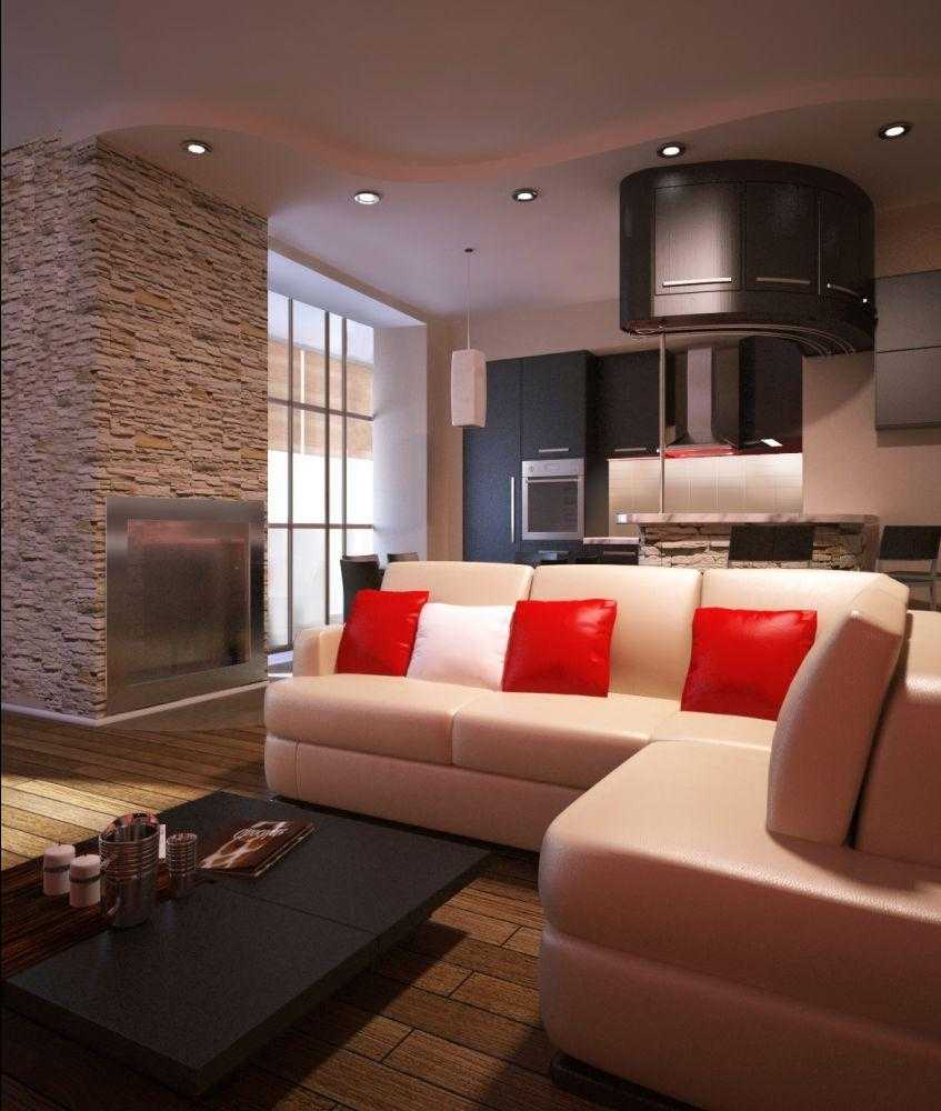 Для того, чтобы визуально расширить пространство, можно выполнить потолок из гипсокартона в светлых тонах: серо-голубом, жемчужном и т. д. Если же площадь гостиной большая и такой эффект нежелателен, то лучше использовать пастельные цвета. Вкрапление ярких оттенков придаст живости всему интерьеру.