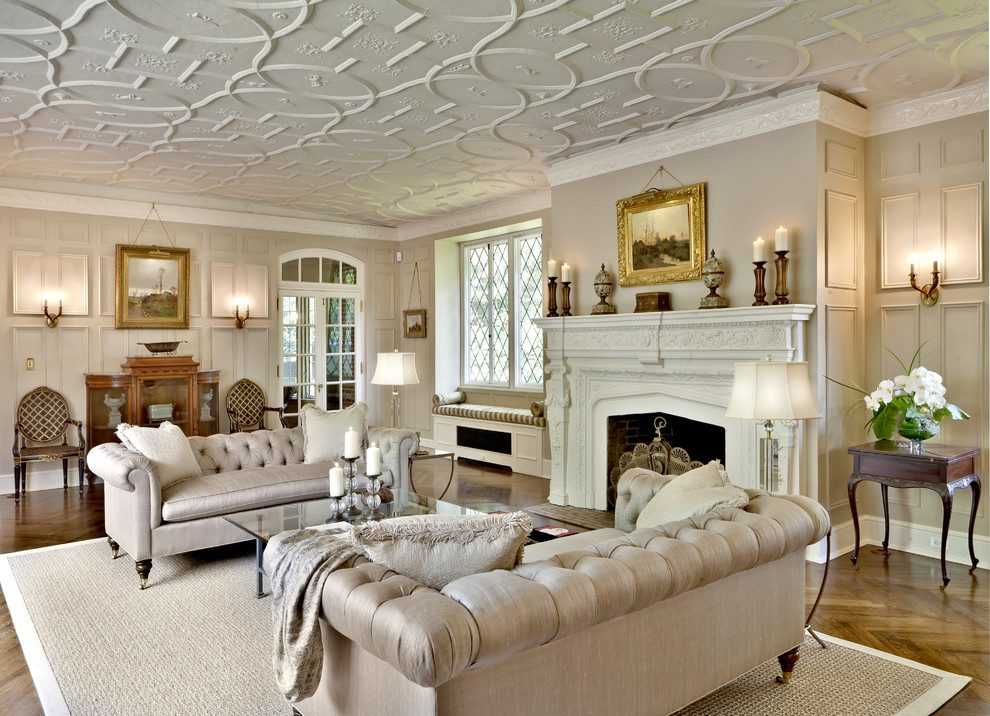 При оформлении гостиной в классических стилях очертания фигур и их расположение относительно центра всегда симметрично. В современных стилях, где предполагается зонирование комнаты, ярусы размещают по зонам, обозначая их таким образом. Иногда фигуры на потолке и стене используются в качестве перегородок в зале.