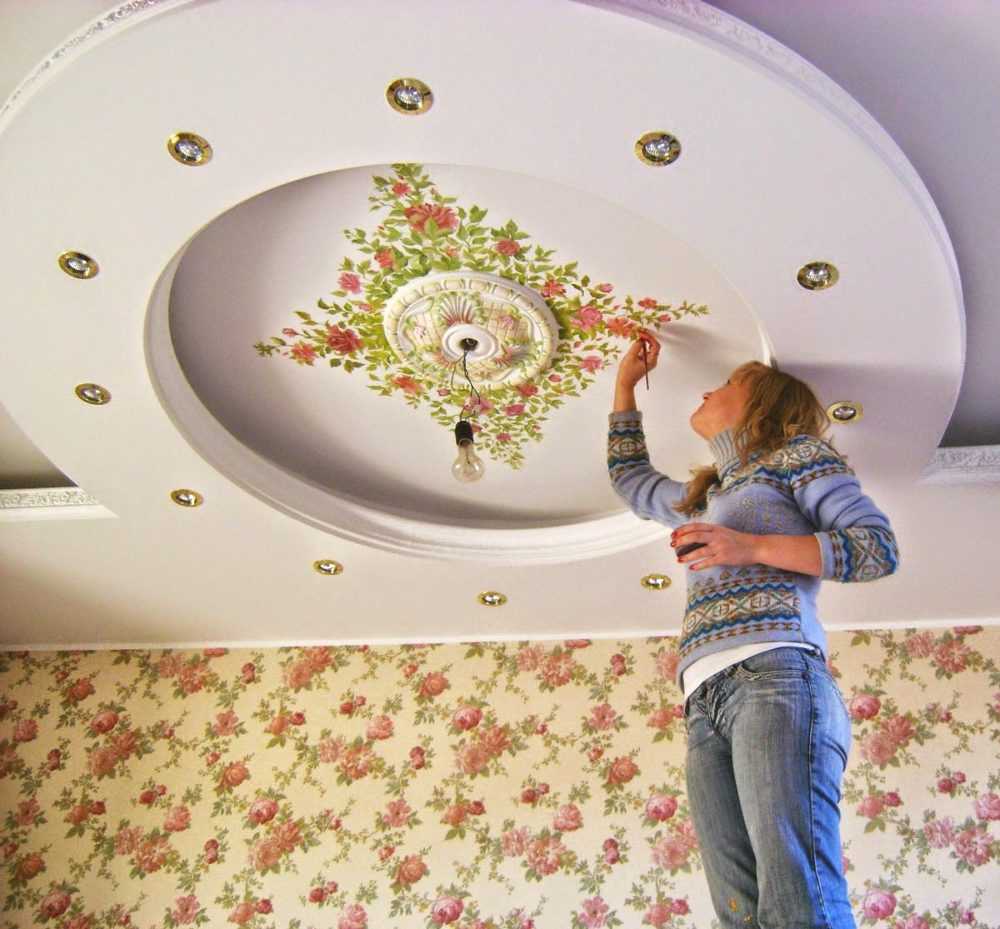 На заметку! Более сложным орнаментом считается применение трафарета, его шаблон стоит приобрести или изготовить заранее. Закрепив его на потолке, можно распылять краску из баллончика или покрасить валиком, после чего снять.