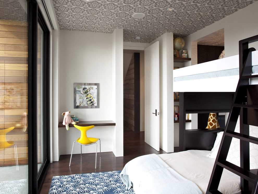 На первый взгляд покажется, что перекрытие сделано из бетона — однако это было бы не слишком удобно. Даже в частном доме потолки из гипсокартона, использованного на этом фото, гораздо функциональнее — они скроют трубы и проводку.