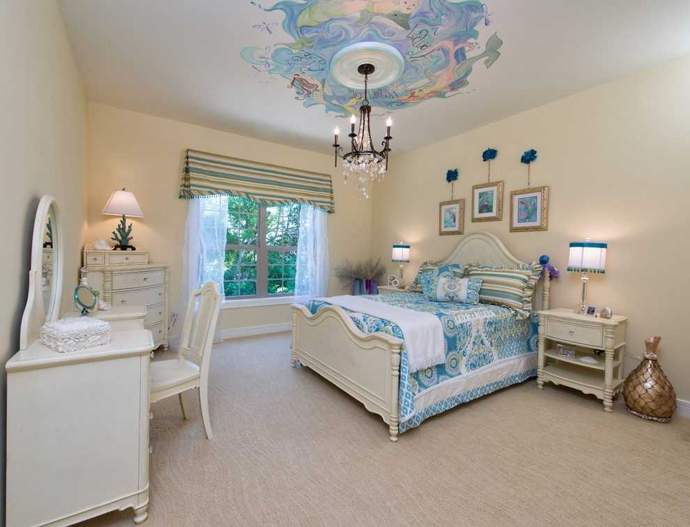 К самым простым типам узоров, доступным даже для мастеров без художественного таланта, относятся геометрические рисунки. Для нанесения узора можно воспользоваться чертежом на бумаге или использовать малярную ленту. Для этого необходимо закрепить ее на потолке, нанести поверх краску, а затем снять, оставив рисунок на месте ленты.