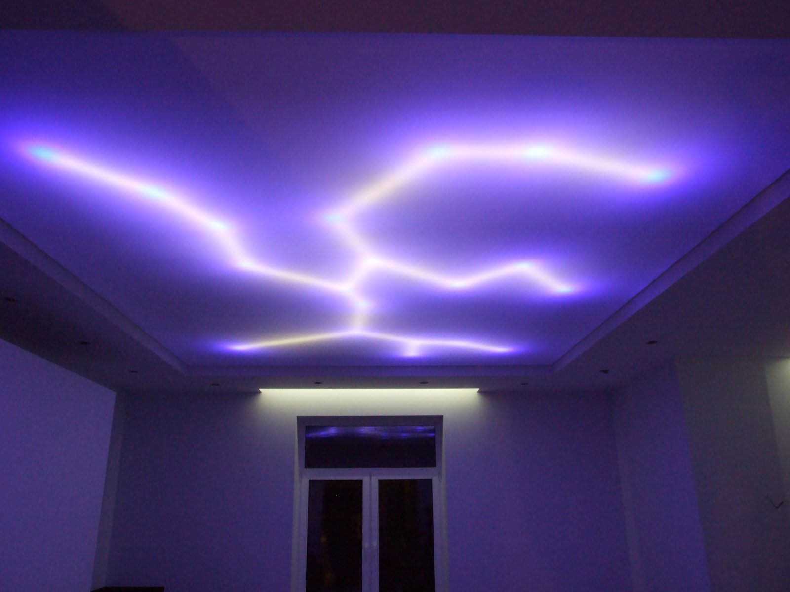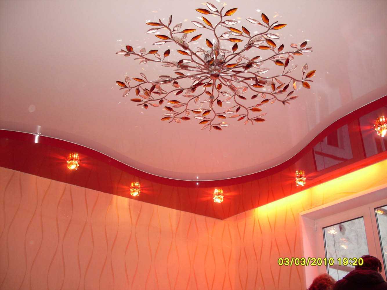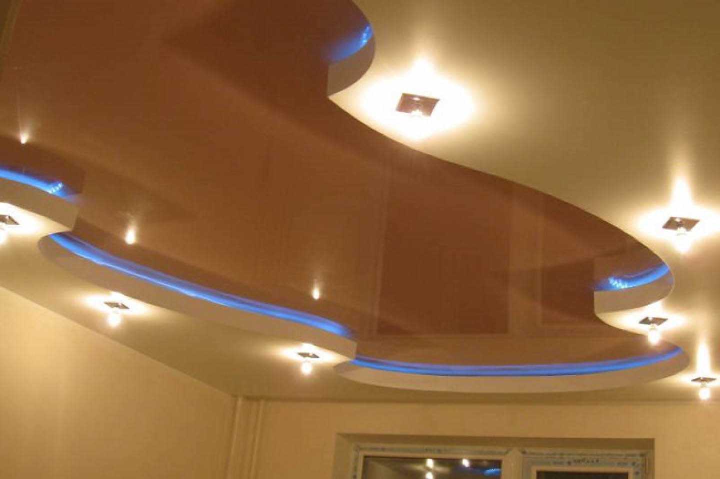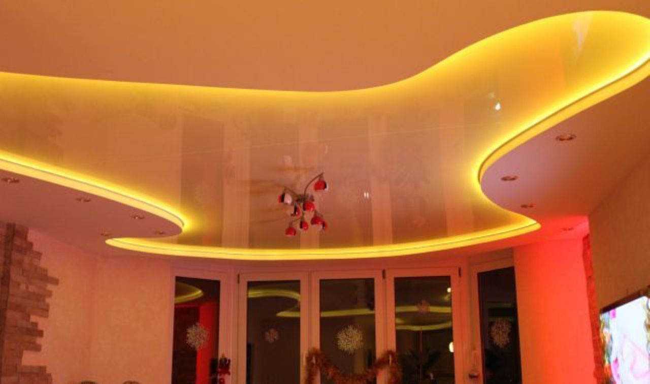 Предлагаем взглянуть на самые интересные способы взаимодействия многоуровневых натяжных конструкций с разными источниками освещения.