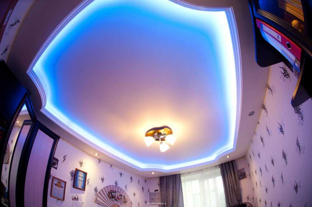 - Светодиодные ленты. Подходят для монтажа на потолке сложной геометрической формы, благодаря гибкости ленты. Они подсвечивают уровень изнутри по периметру. Используются совместно с контроллером светодиодной ленты, который позволяет включать и отключать ее, менять степень и оттенок освещения, выбирать подходящий режим.