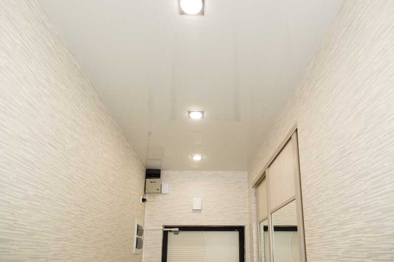 Глянцевый натяжной потолок способен исправить эту проблему. Благодаря отражению света такие полотна делают коридор визуально просторнее.