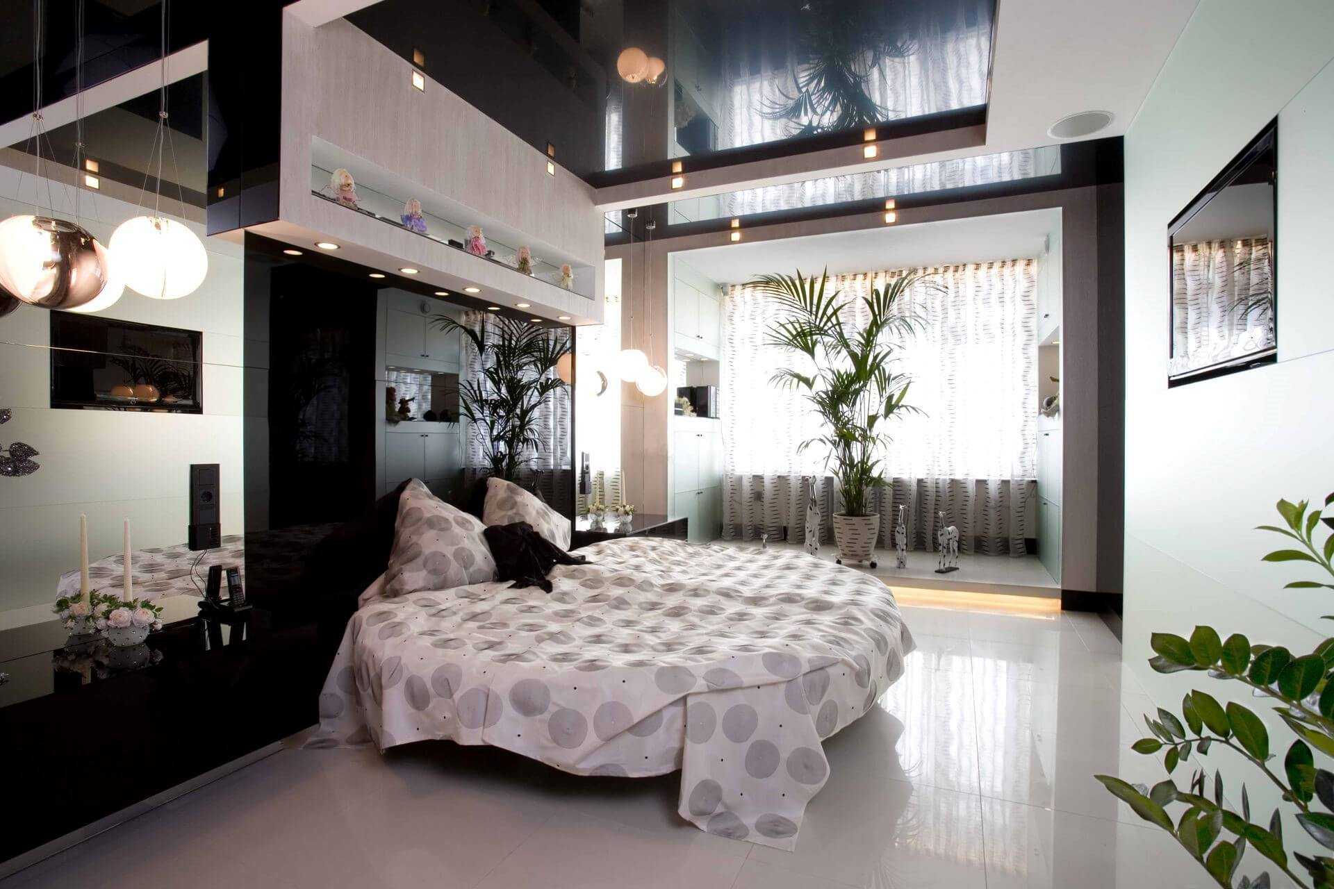 Главное – учтите, что глянцевая поверхность в сочетании с освещением дает яркие блики. Если ваша спальня выполнена в более темных тонах, такой эффект пойдет ей только на пользу. Однако глянцевый потолок в белой комнате может раздражать глаза и препятствовать полноценному расслаблению.