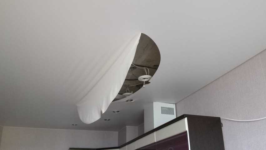 Тканевый натяжной потолок обычно не удается заклеить стандартными способами в силу особенностей данного материала. Но, ткань можно вполне эстетично зашить. Используйте для этого капроновую нить, поскольку она имеет высокую прочность.