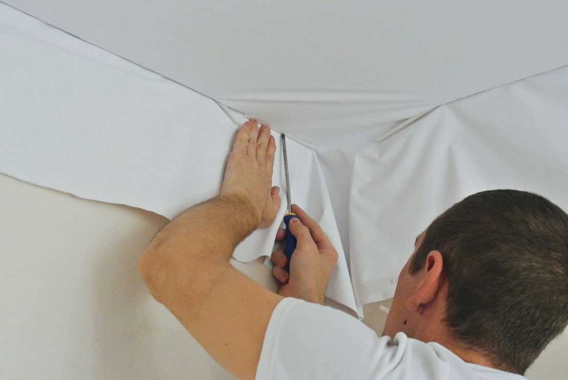 Важно! Чем сильнее натянуто полотно, чем прочнее держит клипса. Если натяжной потолок фиксируют штапиком, то процедуру натягивания без нагрева приходится выполнять двумя руками. Одной рукой натягивают полотнище на профилем, второй — заталкивают в паз треугольный шнур штапика