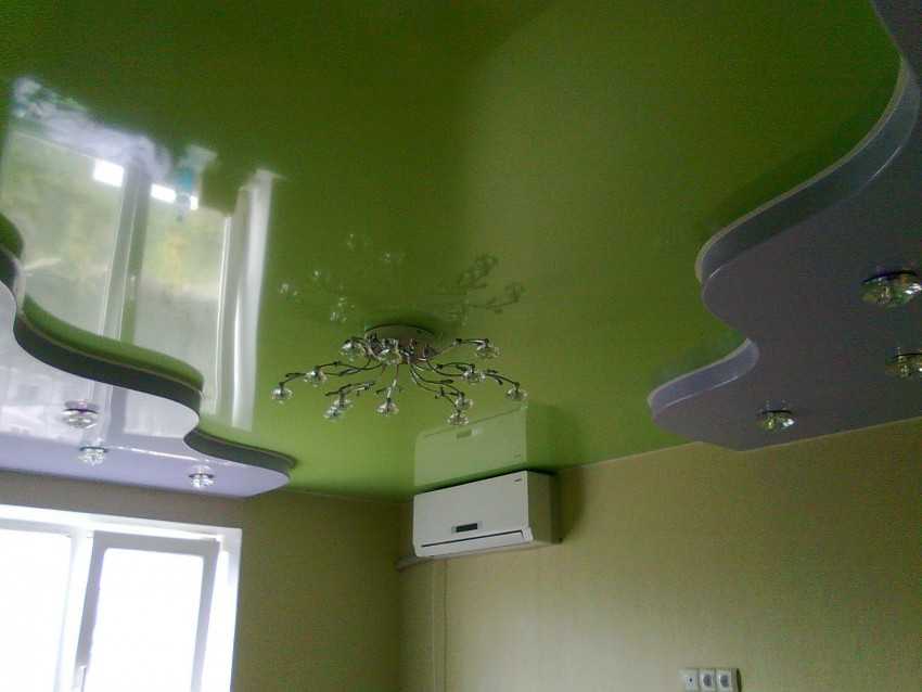 - Глянцевые . Данный вариант используется чаще всего. Разнообразие цветовых решений в данном случае достаточно велико, а сами полотна могут быть двухцветными или многоцветными. Полотно имеет зеркальный эффект, благодаря чему помещение частично отражается на потолке и визуально увеличивается в объеме. Ключевым недостатком глянцевых потолков является заметный шов, который остается после соединения отдельных полос материала.