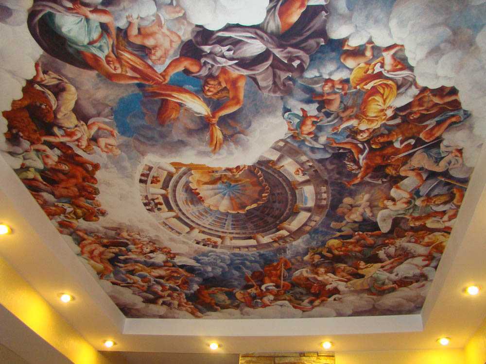 Обратимся к примерам посложнее. Взгляните на полотно ниже. Тут во всей красе предстает 3D-печать. Потолок обретает необходимую глубину, каждый находящийся в комнате буквально ощущает этот величавый объем. Нанесенный рисунок транзитом через орган зрения воздействует на эмоциональную сферу человека и рождает в голове соответствующие образы.