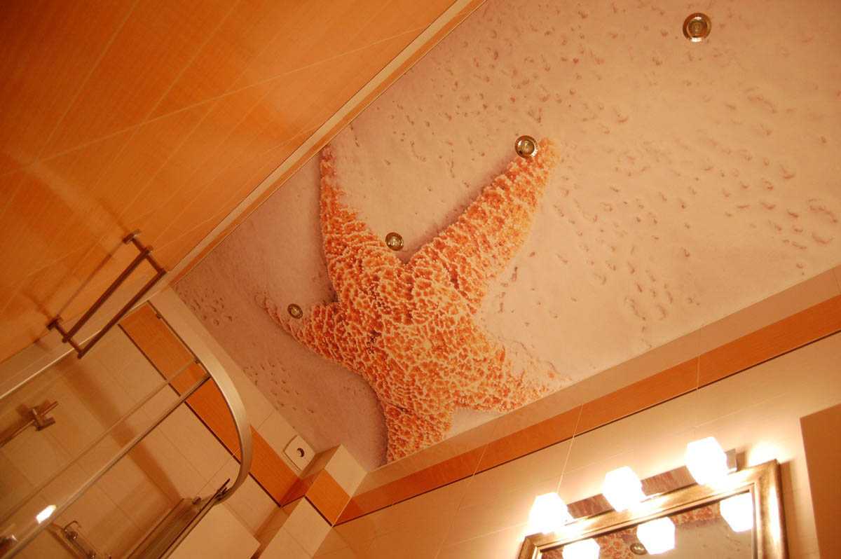 Натяжные потолки в ванную с фотопечатью часто заказывают с морскими или просто водными мотивами: тематика сама навевается ассоциациями.