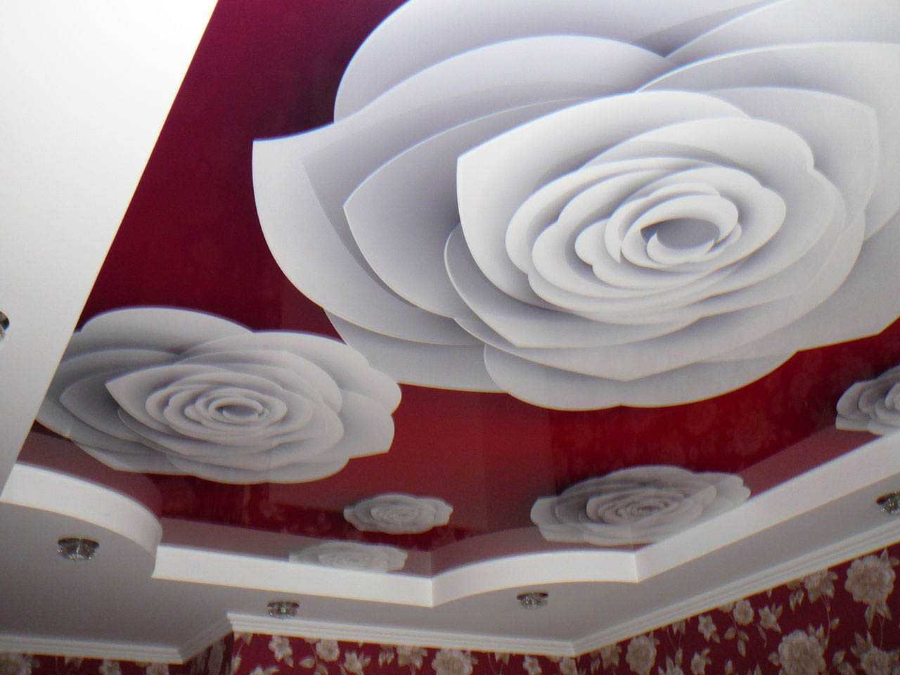 Некоторые производители натяжных потолков выпускают полотна с уже нанесенной фотопечатью. Обычно это популярные рисунки: дневное или ночное небо, цветочные или геометрические узоры, водяные капли. Такое полотно хорошо смотрится в многоуровневых конструкциях в сочетании с однотонным полотном. Более сложные и одиночные рисунки можно заказать по каталогам фирм, занимающихся установкой натяжных потолков.