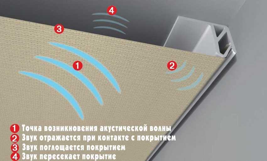 Для изготовления акустики могут применять не только поливинилхлорид, но и полиэфир. Отверстия в полотнах гасят шум не сами по себе, а благодаря находящемуся в них воздуху, понижающему барабанный эффект натянутой ткани. Минимальное расстояние, отделяющее натяжные полотна от перекрытий, составляет 10 см.