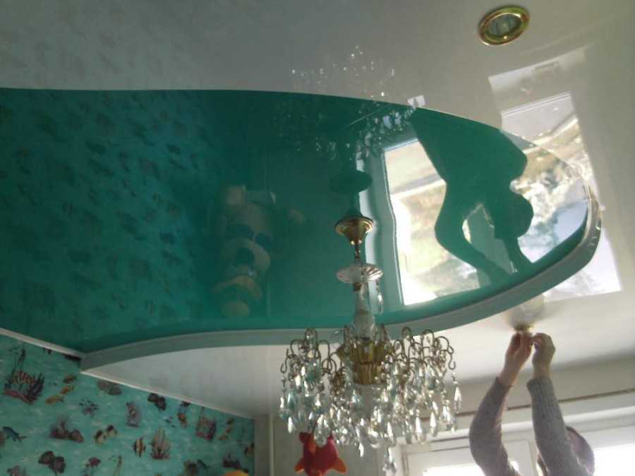 - длительный срок службы, который составляет не менее десятилетия. Компании-производители предоставляют гарантии на натяжные потолки, а с подвесными системами все обстоит не так благополучно, поскольку на их поверхности могут появиться трещины по причине усадки здания. А если затопят соседи сверху, то поверхность из гипсокартона придет в негодность и потребуется новый ремонт. Что касается натяжных полотен, то они способны выдержать значительную нагрузку — так прочность потолков ПВХ составляет 100 килограммов на один метр квадратный: в случае протечки пленка растянется и провиснет, но не порвется. Собравшуюся воду сливают, не снимая полотно, в результате чего поверхность принимает прежний вид. Кроме этого на натяжной системы не собирается конденсат, по этой причине их монтируют в помещениях, где постоянно фиксируется повышенная влажность;