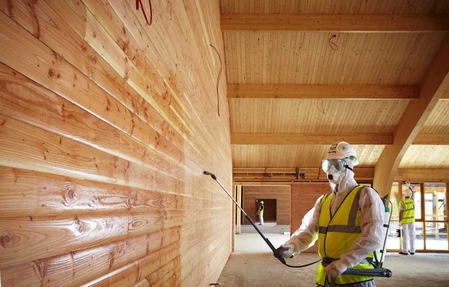Сначала необходимо обработать вагонку и брусья специальными растворами. Они позволят обезопасить материал от действия грибка и создадут противопожарный эффект. Средство наносится на всю поверхность (не стоит забывать о пазах).