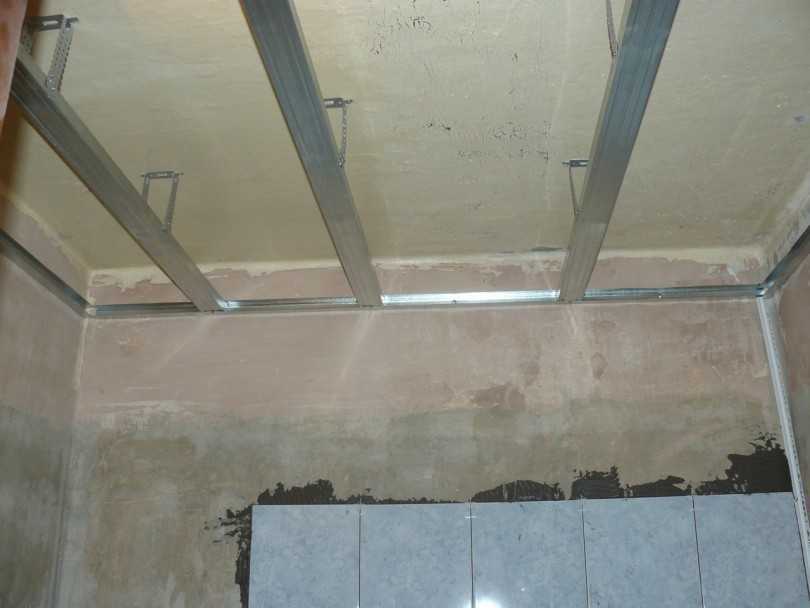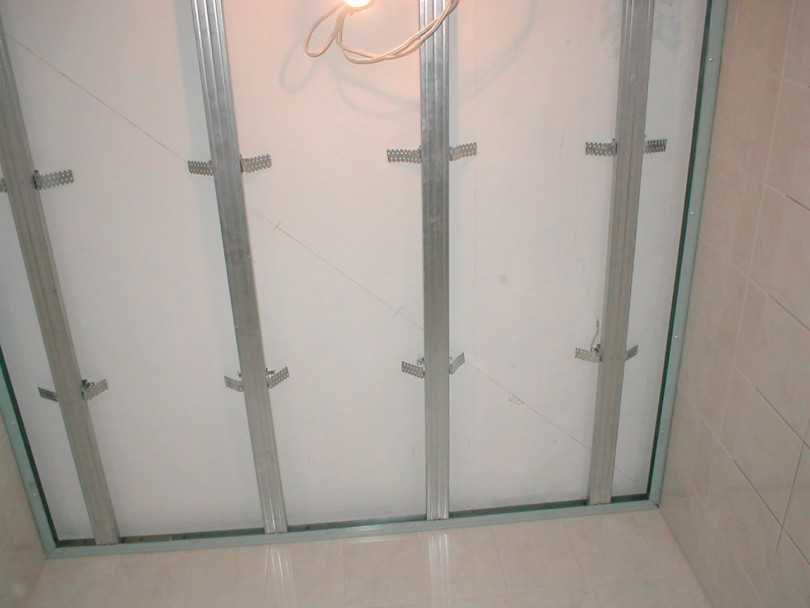 Затем при помощи подвесов и профиля CD-60 создаются направляющие рейки, к которым и будут крепиться панели ПВХ. Оптимальное расстояние между ними – 500 миллиметров. Металлический профиль CD-60 устанавливается крышкой к полу, концы реек следует вставлять в профиль основного каркаса.