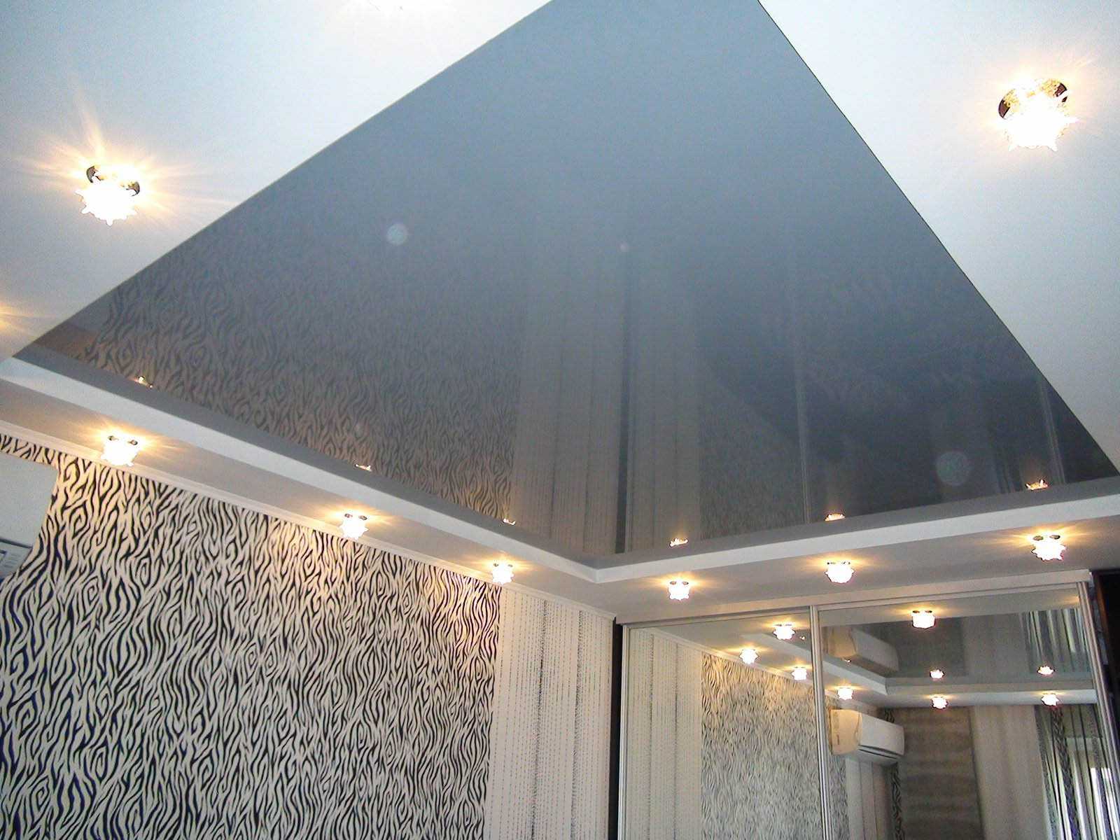 - если ваша конструкция представляет собой двухуровневый «гибрид» подвесного гипсокартонного потолка и натяжного зеркального модуля, то удачным будет решение разместить по периметру гипсокартонной рамы точечные светильники — так потолок будет выгодно подсвечиваться спотами и приобретет нужный объем;