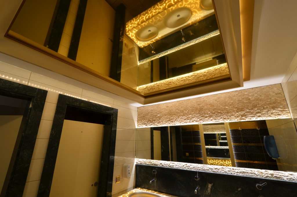 Желательно чтобы на потолке и других предметах интерьера присутствовали общие элементы. Так, можно предусмотреть наличие одинаковых узоров на душевой кабине, подвесном зеркале, потолке