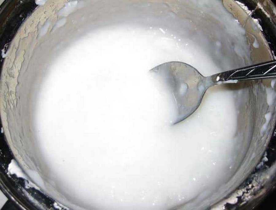 - Сварите клейстер из литра воды с 2 ложками крахмала (пшеничной муки). Нанесите на поверхность. Дождавшись, когда он высохнет, снимите корку шпателем.