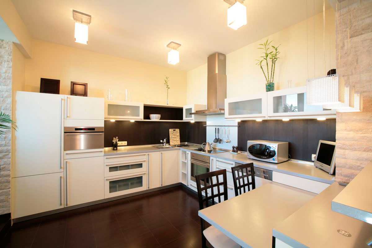 Независимо от выбранного способа, поверхность получится очень ровной. В такой потолок можно встроить точечные светильники. С их помощью можно и просто осветить кухню, и зонировать ее. Например, над обеденной зоной сделать основное освещение, а над рабочей зоной установить подсветку, что значительно повысит комфорт хозяйки в процессе приготовления пищи.